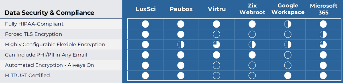 The top email providers possess a variety of data security and compliance postures, with LuxSci and Paubox being the most robust when it comes to data security and HIPAA compliance.